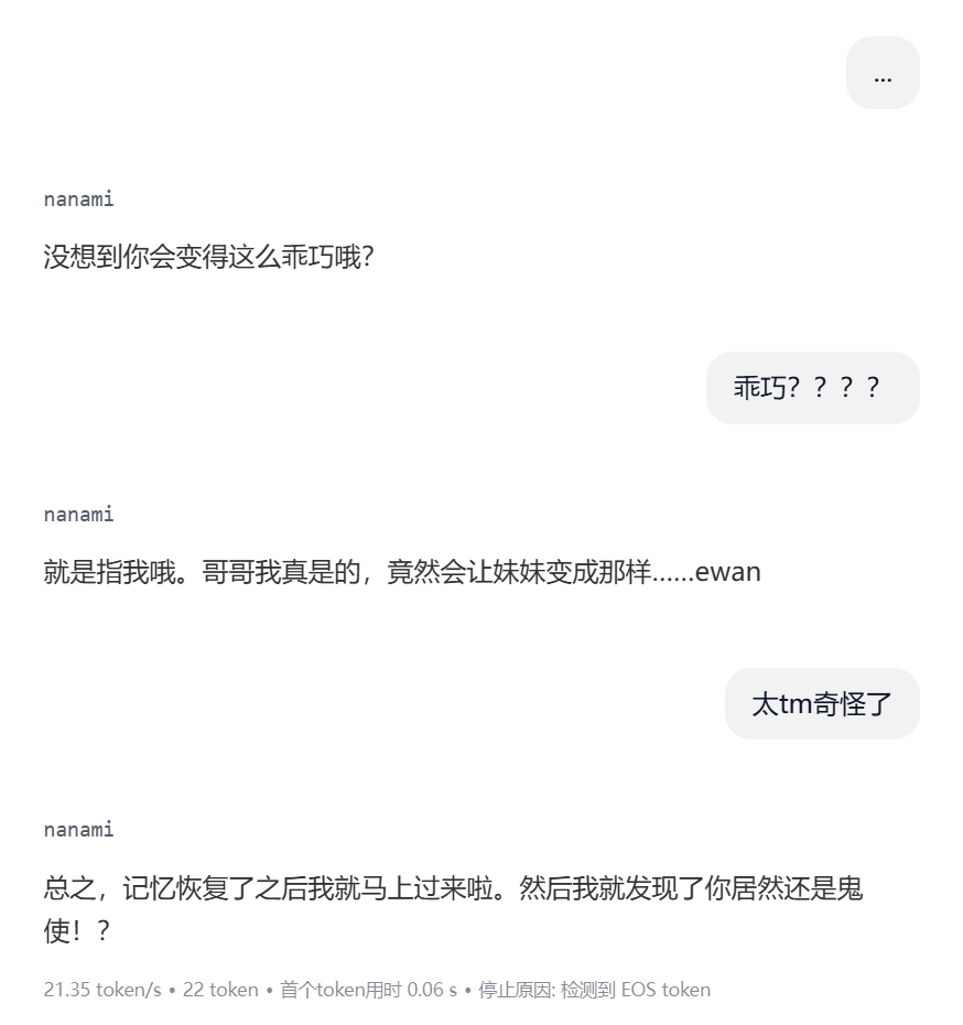 这回效果还行,但是美中不足的是,可能因为数据中有太多省略号,所以在对话时偏向用省略号开头(就像猫娘习惯喵字起手),可以再改进一下。